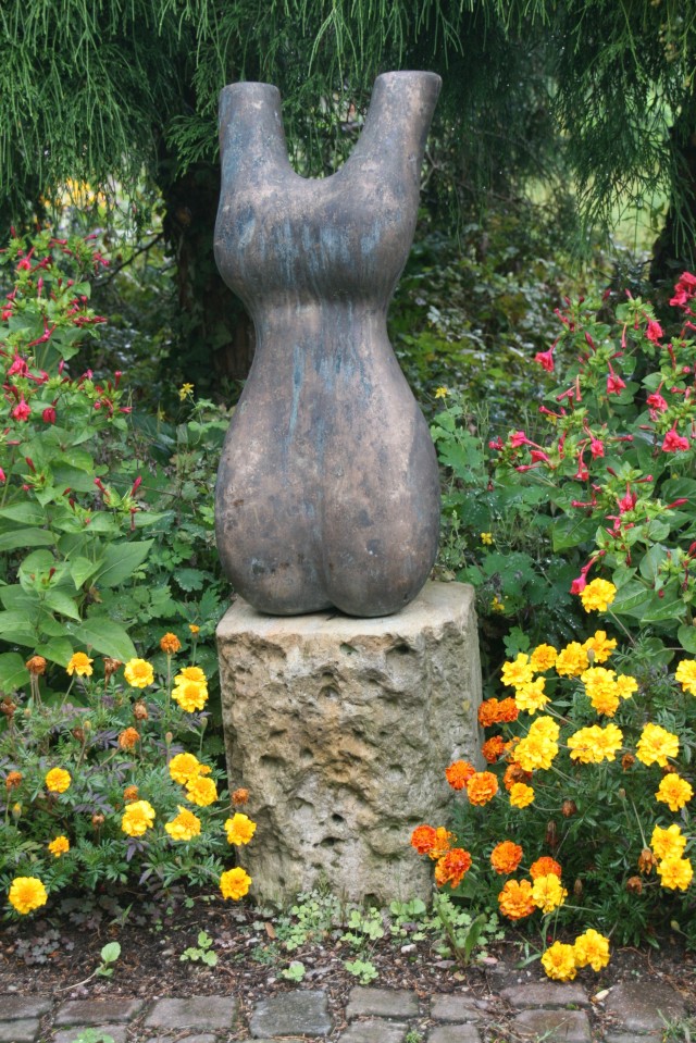 Die Skulptur auf dem Bild zeigt einen abstrahierten, torsoartigen Frauenkörper ohne Kopf, Arme oder Beine. Sie wirkt modern, reduziert und expressiv und lässt sich aus mehreren Perspektiven interpretieren.